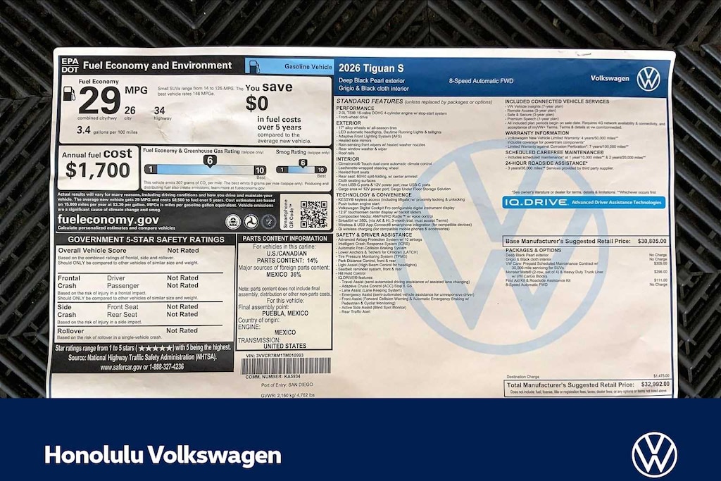 Honolulu Volkswagen is a trusted Volkswagen dealership in Honolulu, Hawaii, proudly serving drivers across Oahu with a full lineup of new Volkswagen models, certified pre-owned Volkswagens, and quality used vehicles. Conveniently located in Honolulu, we serve customers from Waianae, Kapolei, Ewa Beach, Waipahu, Waikele, Pearl City, Hawaii Kai, Aiea, Mililani, Haleiwa, Waimanalo, Kailua, Kaneohe, Laie, Hauula, Kaaawa, Waialua, Wahiawa, Makakilo, Kalihi, Kaimuki, and Waikiki, as well as military communities including Joint Base Pearl Harbor-Hickam, Schofield Barracks, Pearl Harbor, Fort Shafter, and Marine Corps Base Hawaii. Whether you??re searching for a new Volkswagen for sale in Honolulu, an used car dealership on Oahu, or a Volkswagen dealer near me, Honolulu Volkswagen delivers competitive pricing, transparent offers, and a stress-free buying experience. Browse our inventory online or visit us today at ð??? https://www.honoluluvw.com Plus government fees and taxes and $795 dealer document processing fee. MSRP includes destination and handling fee. Additional cost for dealer installed accessories. Price includes: $1000 - Customer Bonus. Exp. 03/02/2026