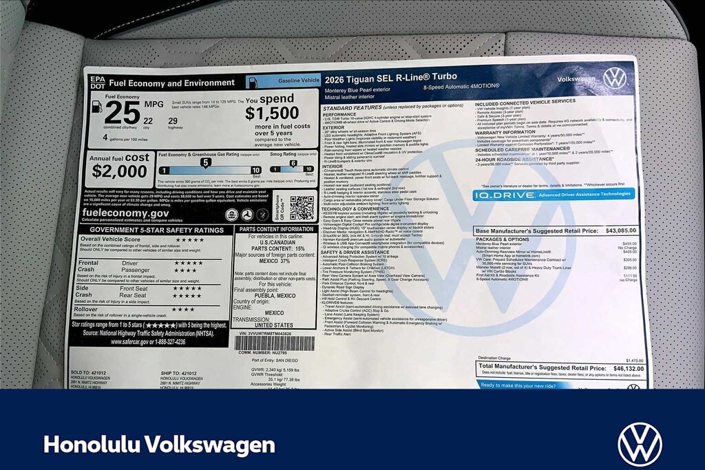 Honolulu Volkswagen is a trusted Volkswagen dealership in Honolulu, Hawaii, proudly serving drivers across Oahu with a full lineup of new Volkswagen models, certified pre-owned Volkswagens, and quality used vehicles. Conveniently located in Honolulu, we serve customers from Waianae, Kapolei, Ewa Beach, Waipahu, Waikele, Pearl City, Hawaii Kai, Aiea, Mililani, Haleiwa, Waimanalo, Kailua, Kaneohe, Laie, Hauula, Kaaawa, Waialua, Wahiawa, Makakilo, Kalihi, Kaimuki, and Waikiki, as well as military communities including Joint Base Pearl Harbor-Hickam, Schofield Barracks, Pearl Harbor, Fort Shafter, and Marine Corps Base Hawaii. Whether you??re searching for a new Volkswagen for sale in Honolulu, an used car dealership on Oahu, or a Volkswagen dealer near me, Honolulu Volkswagen delivers competitive pricing, transparent offers, and a stress-free buying experience. Browse our inventory online or visit us today at ð??? https://www.honoluluvw.com Plus government fees and taxes and $795 dealer document processing fee. MSRP includes destination and handling fee. Additional cost for dealer installed accessories.